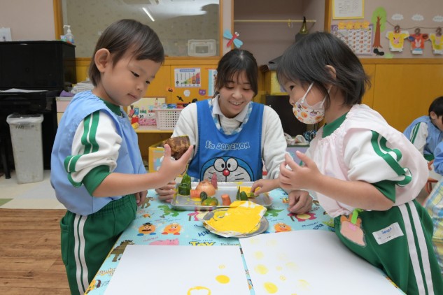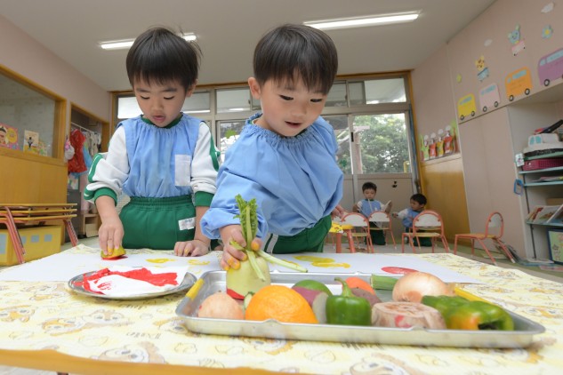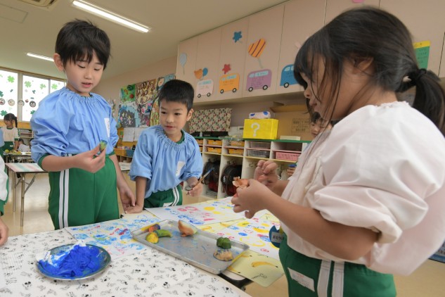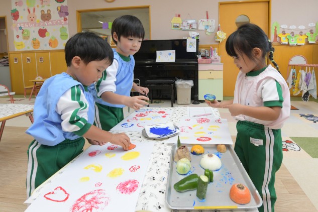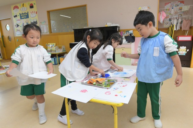 断面に絵具をつけ画用紙に押すだけなのですが、