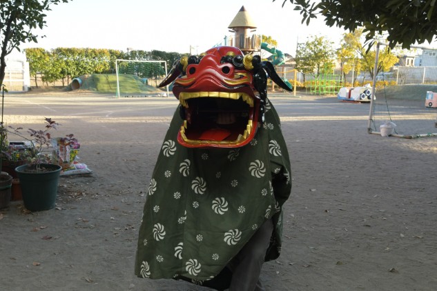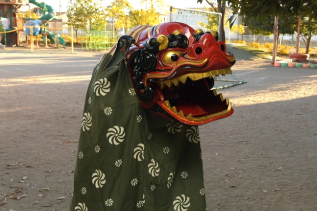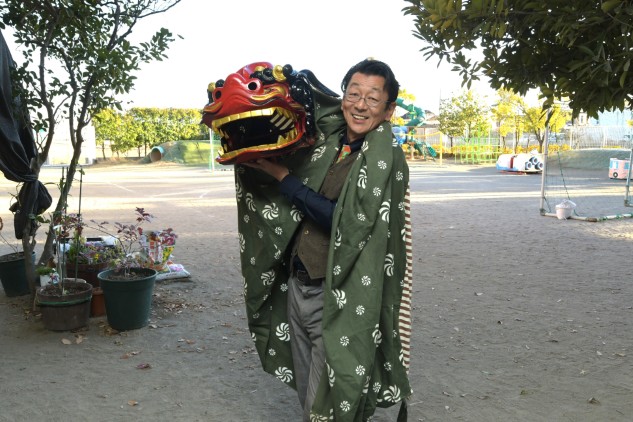 獅子は恐ろしい形相をしていますが、中身は私ですので子どもたちは怖がらずに獅子舞を見てくださいね。