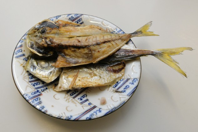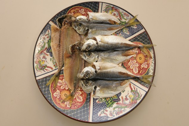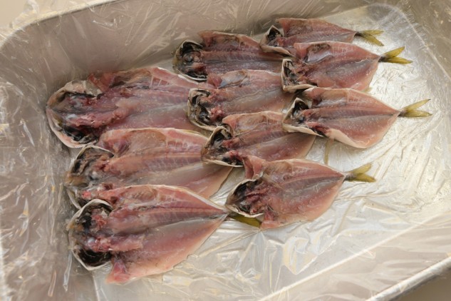 ↑アジの開きです。これは脱水シートを使って干したものですが、もちろんアジはこんな姿で海を泳いでいたわけではありません。