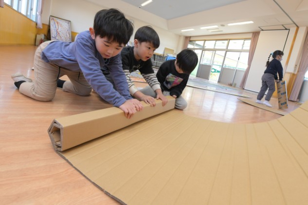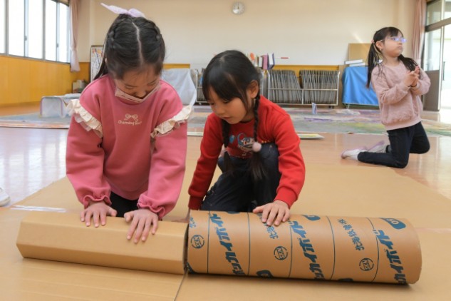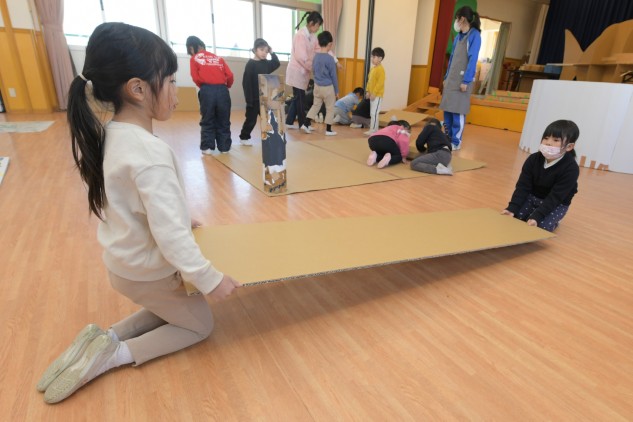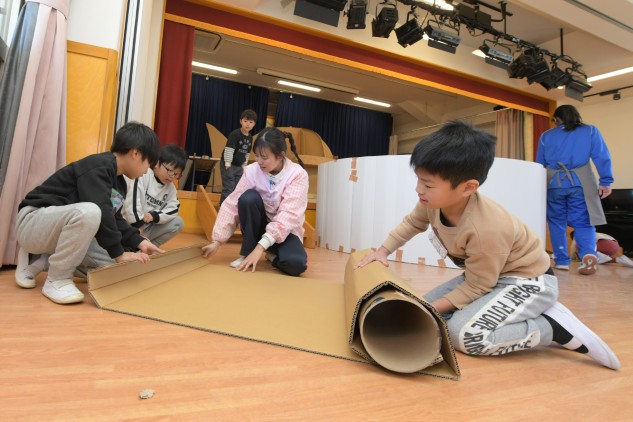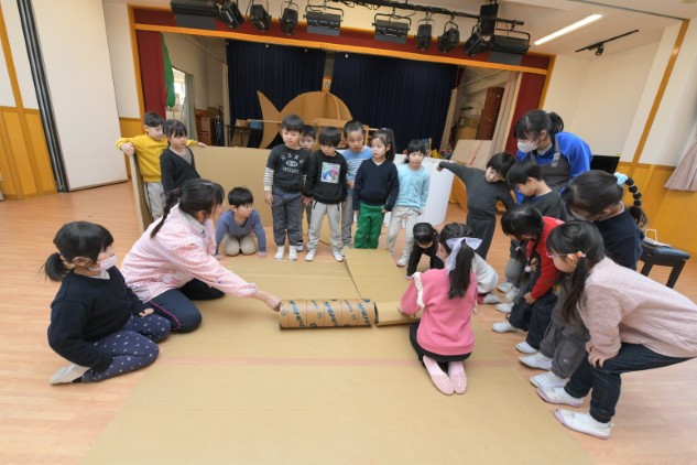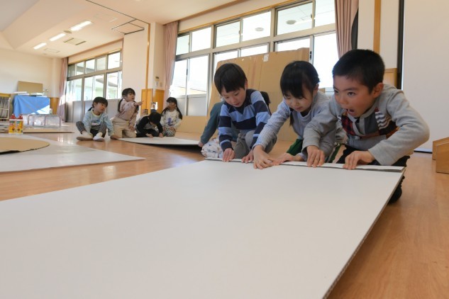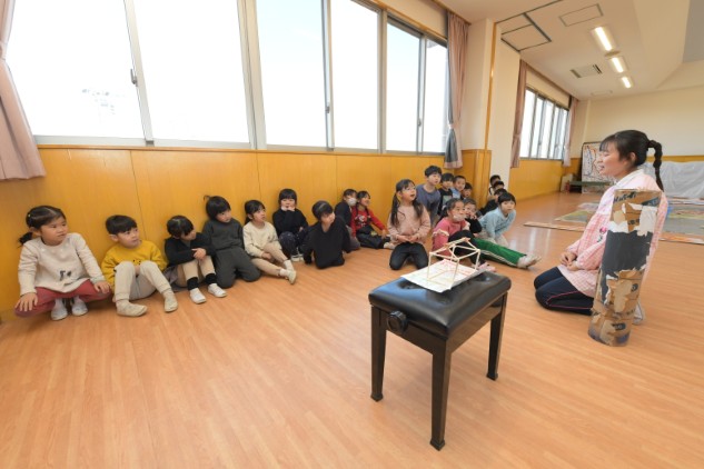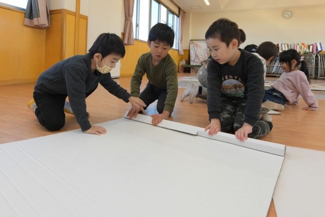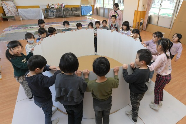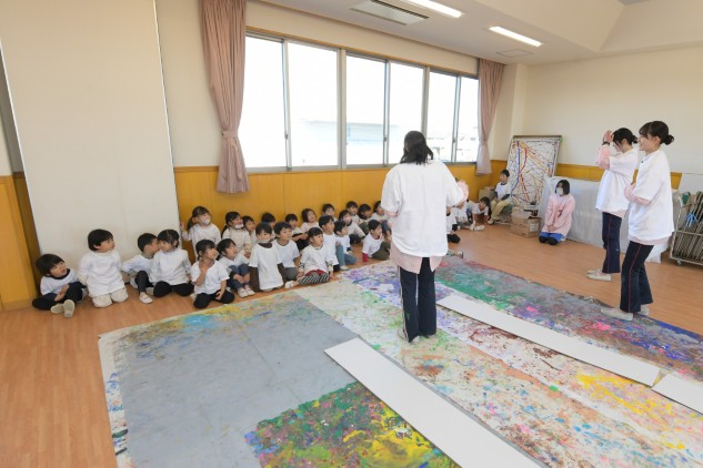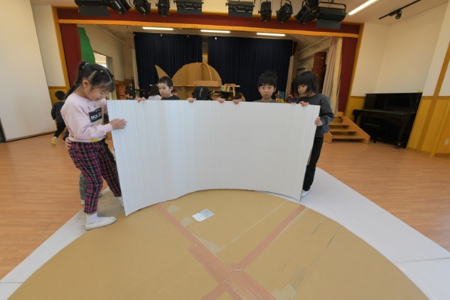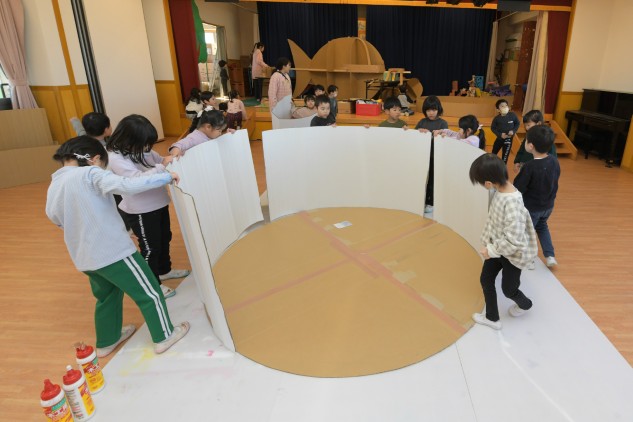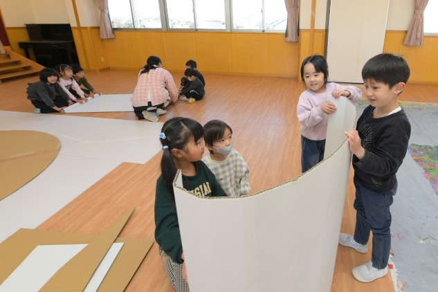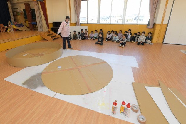 年少組さんたちが白いTシャツを着てホールに集まりました。今日も制作活動です。