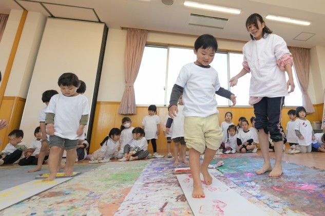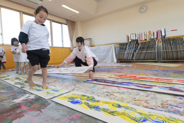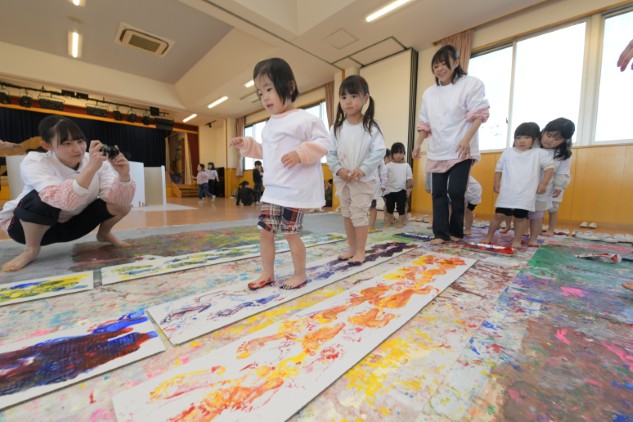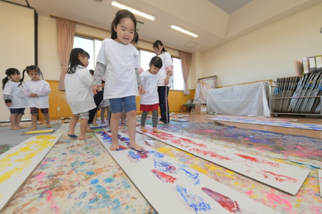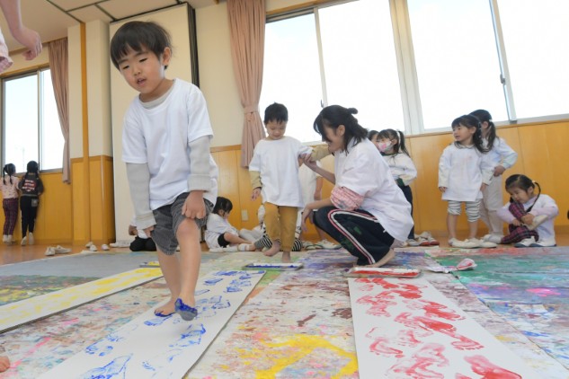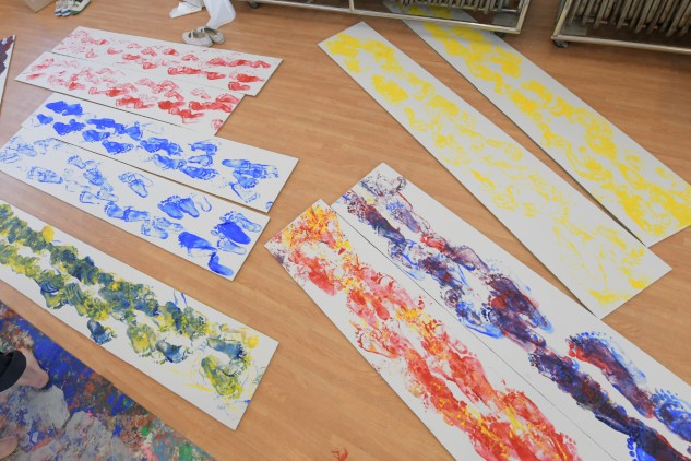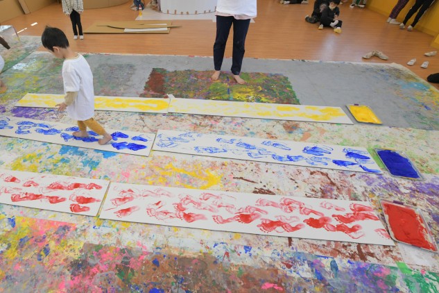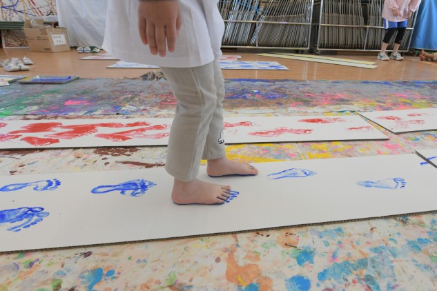 素足に絵具をつけ白いダンボールの上を歩くだけです。