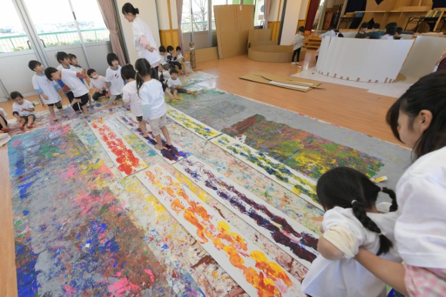 今日も年少さんはアクションペインティングで色遊びをいたしました。歩いただけですけどね。