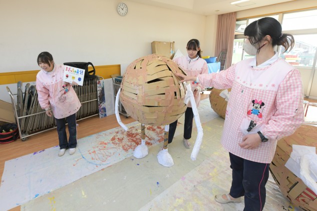 大きな段ボールで形を作り色塗りのための張り子が完了