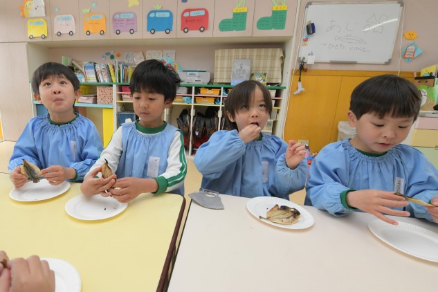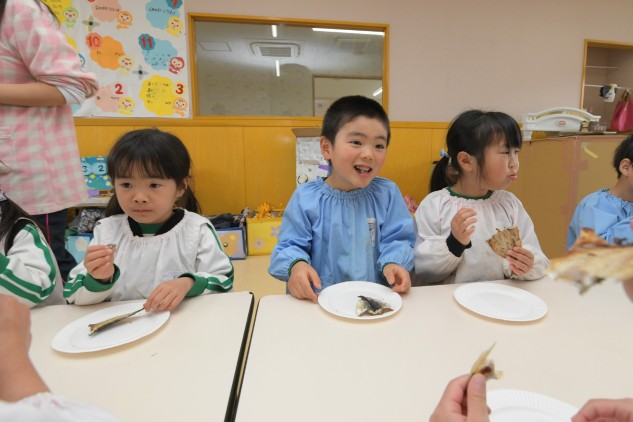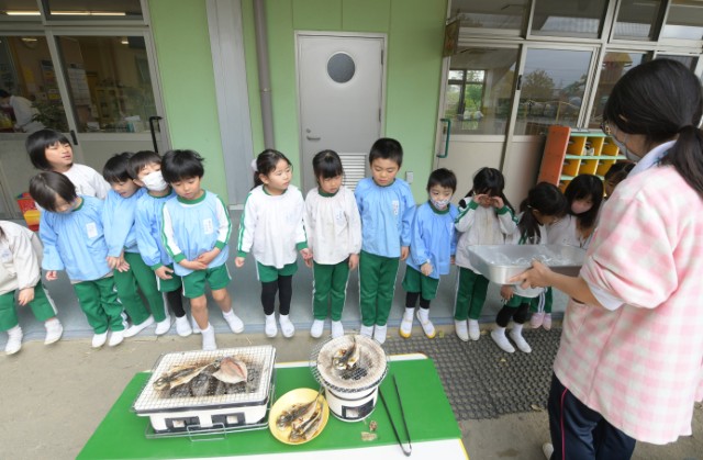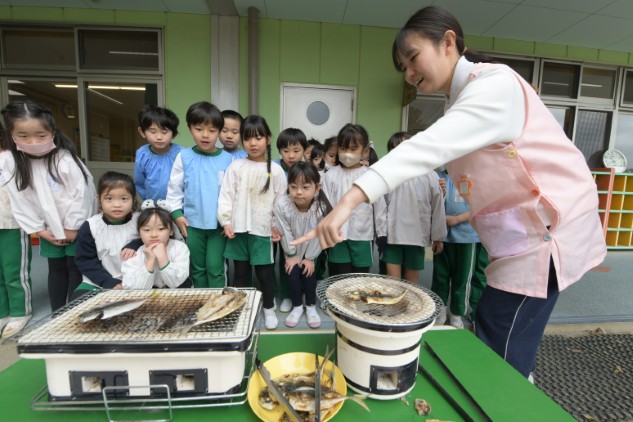 園庭でアジの開きを七輪で焼きました。