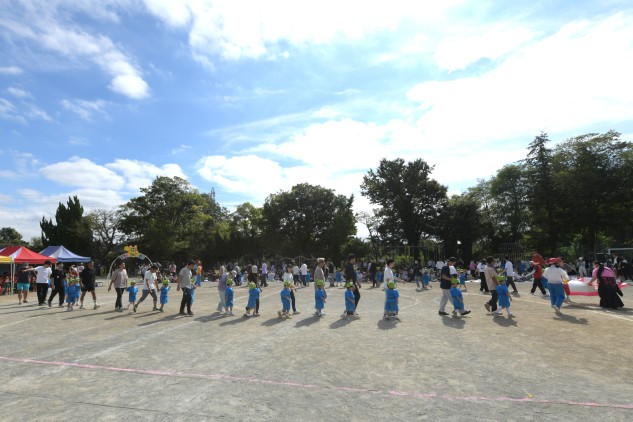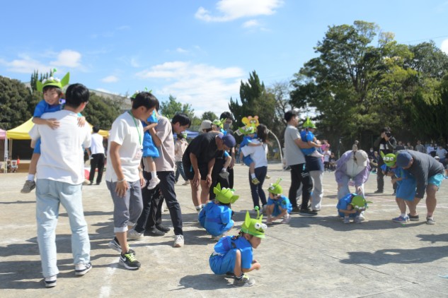 先ずはグラウンドの中央にいるたくさんのリトルグリーメンの中から自分の子どもを見つけ出してもらいます。