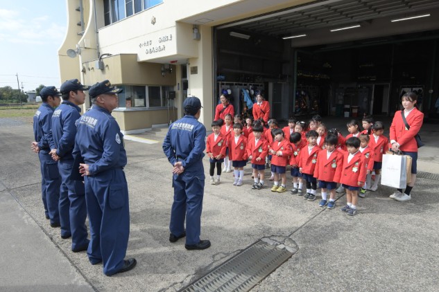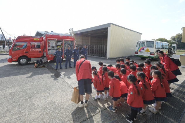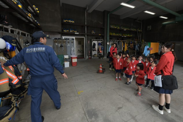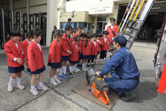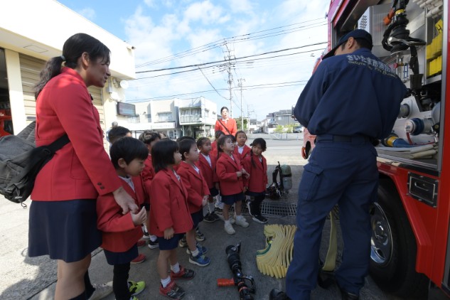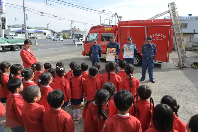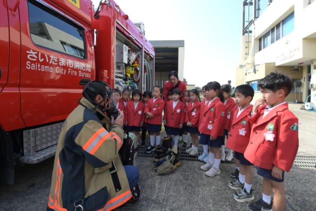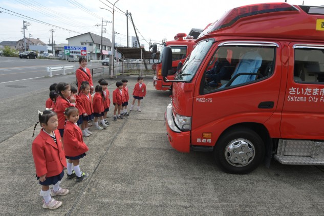 年中さんの訪問先は、赤い車でお馴染みの消防署です。