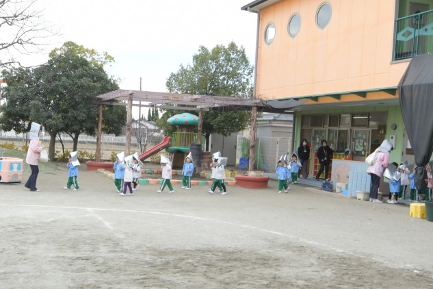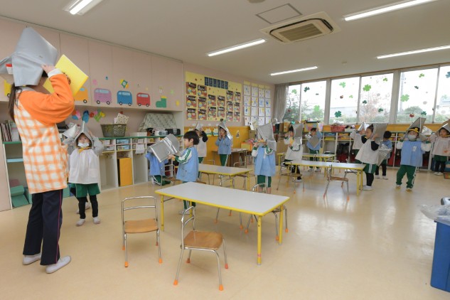 現在の耐震基準からすると建物は倒壊しないといわれています。しかし何が起こるか分かりません。安全を確認したのち避難します。子どもたちは防災頭巾を装着します。