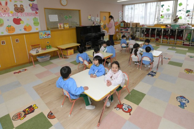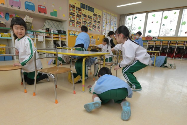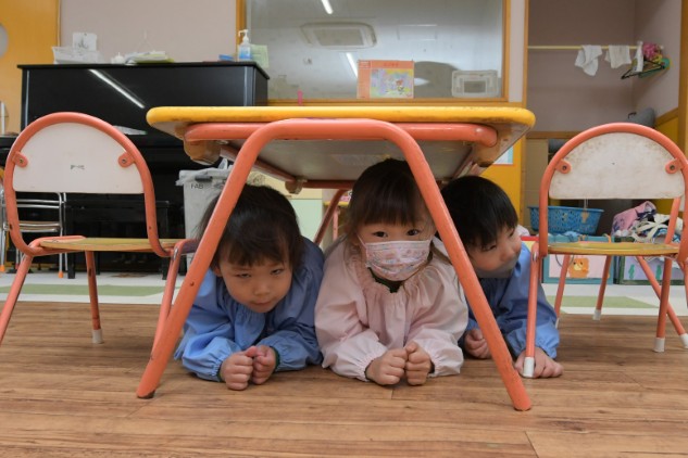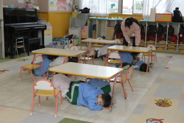 一斉放送で地震発生が各お部屋に伝えられます。子どもたちは先生のお話をよく聞いてあわてずに落ち着いて行動しましょう。