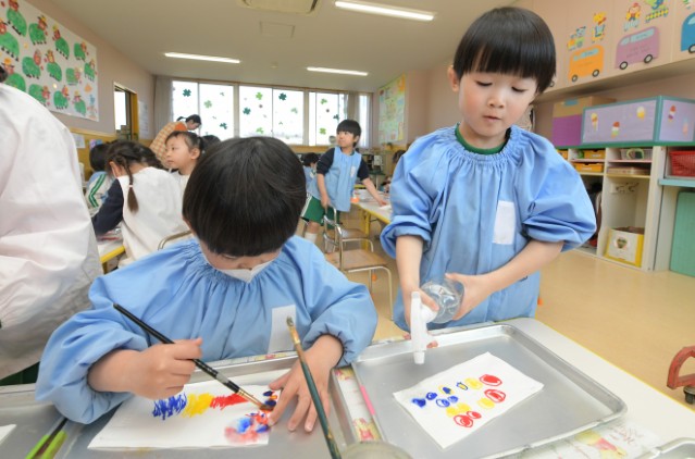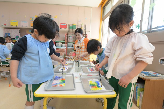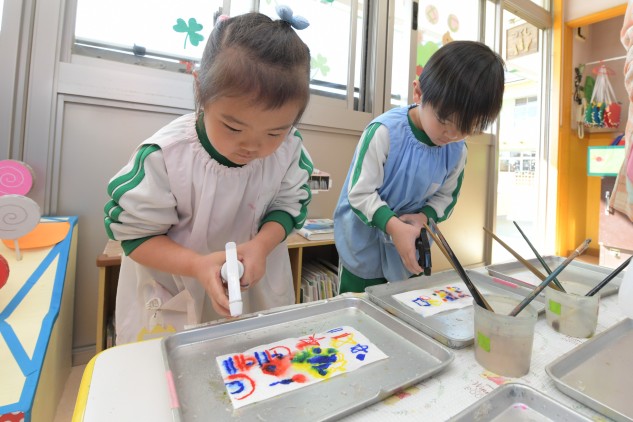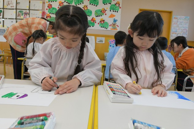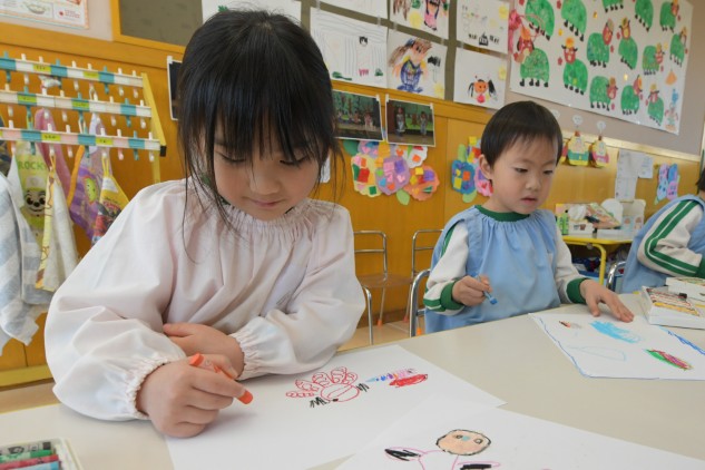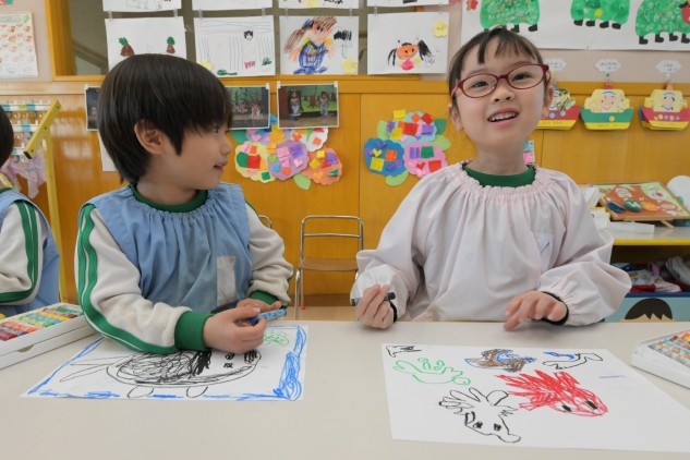 海がないからといっても海の絵本は読みますよ。今日の年中組さんたちは自分の考える海の中の世界を絵にしました。