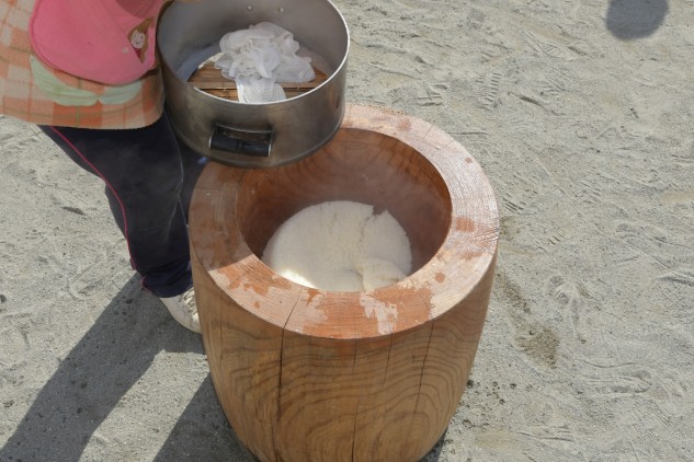 炊き立てのご飯のようなもち米を杵でつぶして、そして杵でつけばおもちになります。