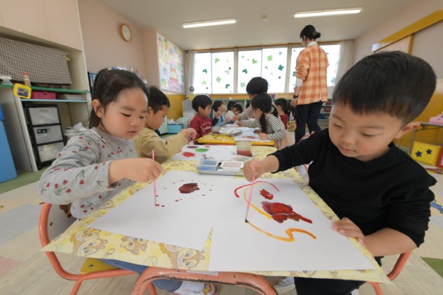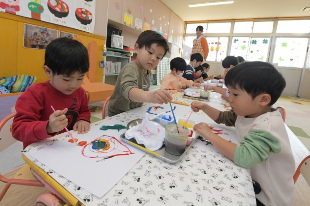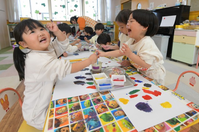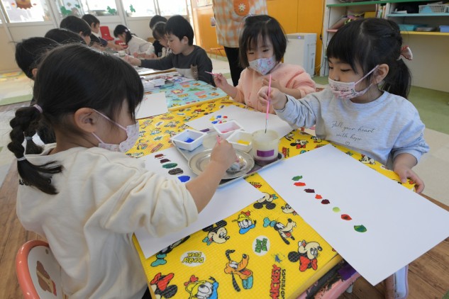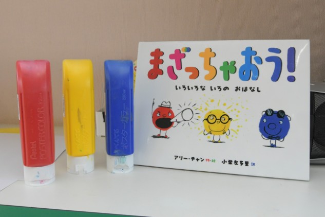 今日の年少組さんたちは、絵本をもとに色遊びをいたしました。
