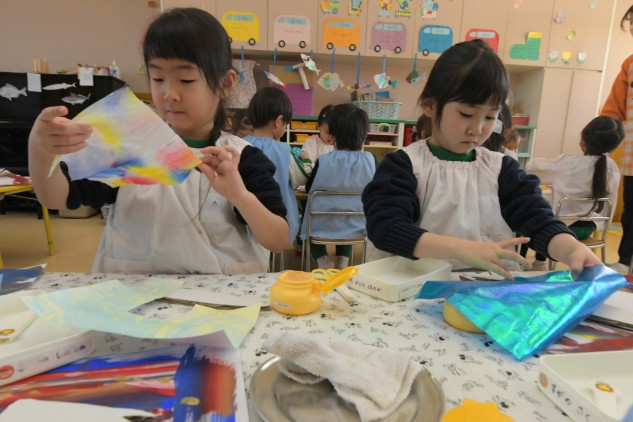 素材の貼り方は自由なので様々な魚たちが出来上がると思います。子どもたちがにじいろを探し求めたどりついた魚になったかな?