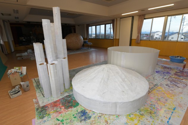 大きな段ボールで形を作り色塗りのための張り子が完了