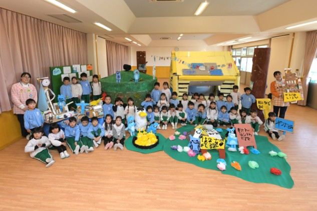 年長さんたちはクラスの集合写真の他に学年での全体集合写真も撮りました。年長さんたちにとって幼稚園生活最後の作品展でした。 が・・・。